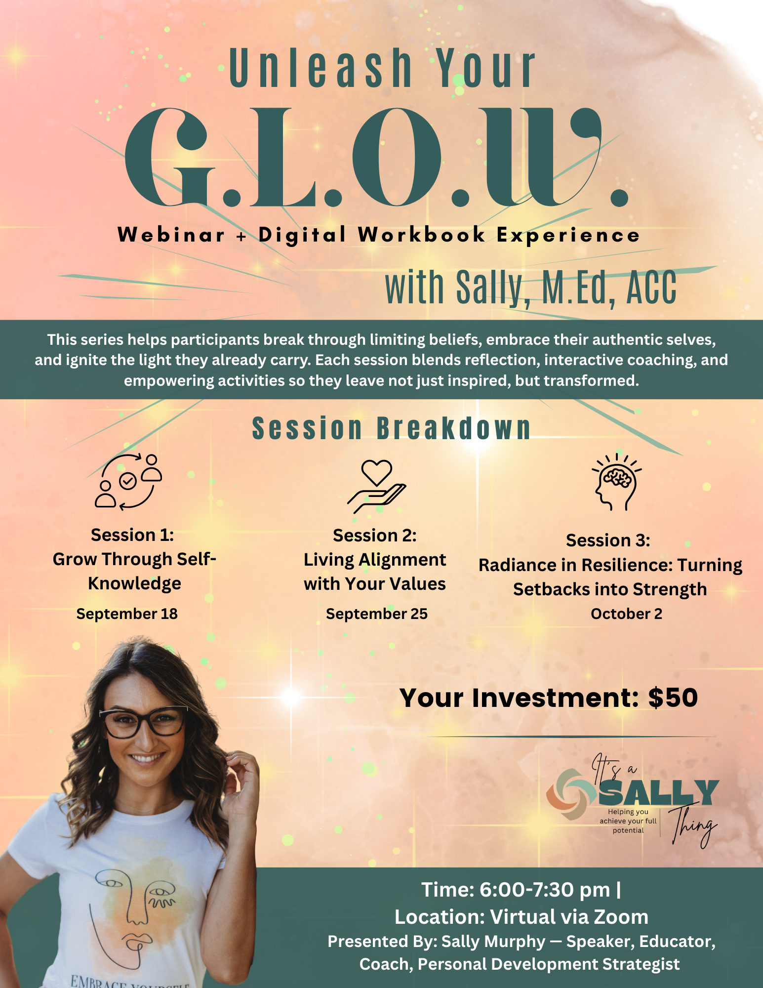 Unleash Your GLOW Within is a 3-part virtual workshop series designed to help you uncover your authentic self, align with your values, and transform setbacks into strength. Join live on Zoom September 18, 25, and October 2 from 6:00–7:30 PM EST. Investment: $50.00 for all three sessions + digital workbook.